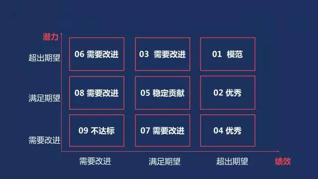 我们需要核心关注的是1号位、6号位、9号位,1号位是高绩效、高潜力,如果这类人没有重点的管理好,就为他人使用了。如果9号位人太多,那意味着效率低和人员作用不大,这是要思考是不是要使用淘汰的策略和措施。6号位是高潜低产能,要思考这类人在企业当中如何发挥潜能做更大的贡献。